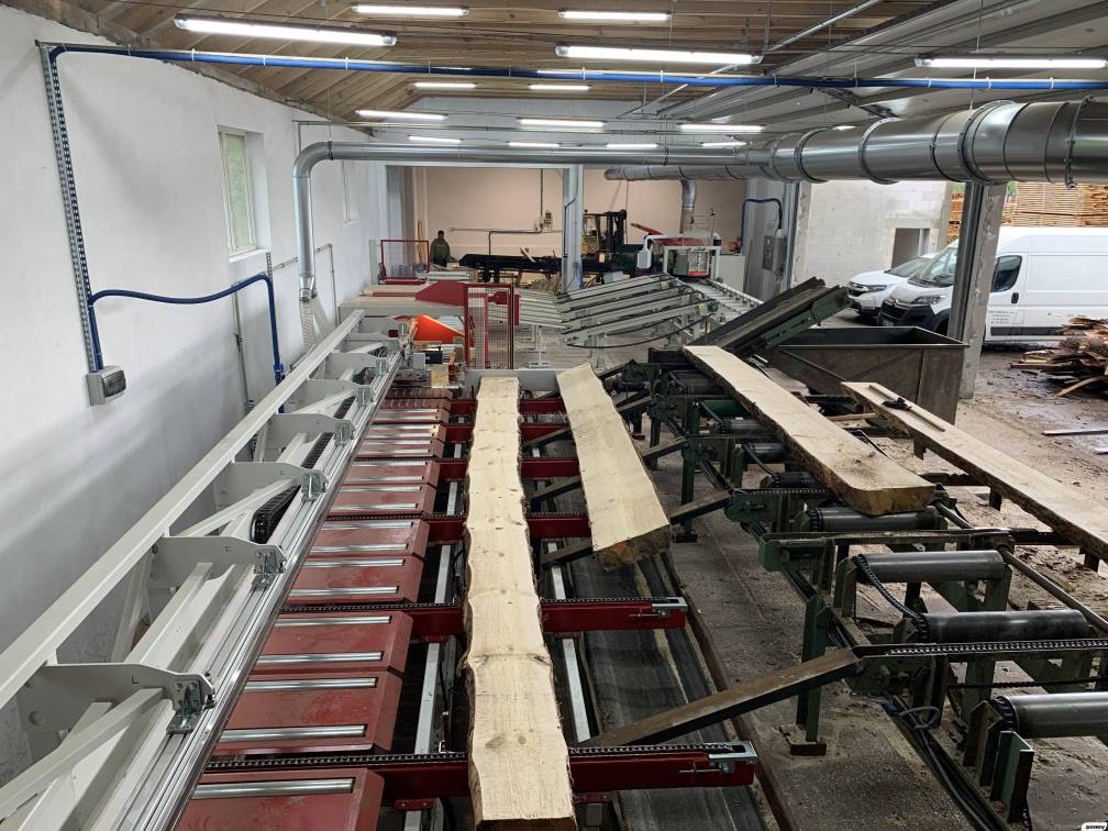 W II kwartale 2020 roku zakończyliśmy projekt gniazda obrzynania pryzmy, który obejmował: zaprojektowanie, wykonanie, dostawę oraz montaż i uruchomienie gniazda obrzynania pryzmy o długości pryzmy minimalnej 730mm a maksymalnej 5000mm. Wszystkie urządzenia są wykonane przez producenta czeskiego STOERI MANTEL oraz TOS SVITAVY, którzy gwarantują pełną synchronizację wszystkich urządzeń zawartych w ofercie. Gniazdo wyposażone jest w stół poprzeczny na który spadają pryzmy z traka taśmowego. Pryzma pojedynczo jest transportowana na stół podawczy pilarki poprzecznej UKS 1000 OPTIM, gdzie wracający popychacz skanuje określoną pryzmę i zostaje cięta wg założonych wytycznych operatora. Po cięciu materiał jest transportowany na stół odbiorczy za piłą oraz zostaje poprzez wyrzutniki transportowany na rolki grawitacyjne gdzie swobodnie opuszcza przenośnik kierując na poprzeczne urządzenie podawcze DWS-4, które ma za zadanie wpuszczenie pryzmy na centrownik tylko 1 pryzmy, pozostałe czekają na transport do urządzenia centrującego DWS-3. Na tym urządzeniu DWS-3 pryzma zostaje wycentrowana do boku podajnika i jest wprowadzona (na tym etapie może jeszcze ręcznie operator zrobić korekcję centrowania) do wielopiły PWR 421. Po wyjściu z wielopiły gotowe elementy są odbierane ręcznie i odkładane na paletę. Obsługa takiej linii wymaga 3-4 osób/ 1 osoba do piły poprzecznej + 1 osoba do wielopiły i centrownika oraz 1-2 osoby do układania materiału głównego po wielopile.